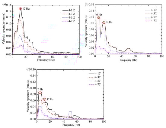 Spectra of vibration velocities at test section 4 # in the (a) vertical direction; (b) X direction; and (c) Y direction.