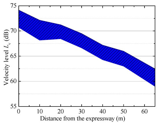 For 35 groups of test data, the vertical velocity vibration level Lv was calculated using Equation (1). Due to the differences that exist in the test data, a 95% confidence interval was employed, as shown in Figure 9. In Figure 9, the total vibration levels at all test points on the ground are exhibited. The vertical velocity vibration level decreased gradually with the increase in distance from the road, indicating that the vibration energy gradually decreased during the vibration propagation, which follows the vibration propagation rule in Ref. [].