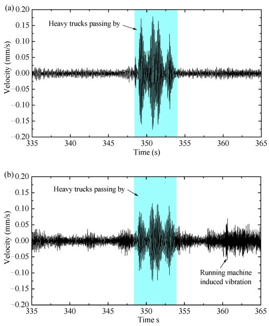 It can be observed from Figure 10 that the response increased significantly during the period of 348 s to 354 s when heavy trucks passed by. However, the response amplitude of the second floor was smaller than that of the first floor in this period, which indicates that the traffic-induced vibration was attenuated with the vibration propagation from the first floor to the second floor. Compared to the responses in the other periods (335 s to 348 s and 354 s to 365 s), it can be observed that the vibration amplitude in Figure 10b is greater than that in Figure 10a. Since the production equipment on the second floor operated continuously for 24 h, the most likely reason for the increase in vibration on the second floor slab in the periods of 335 s to 348 s and 354 s to 365 s is the contribution of vibration due to the operation of production machinery and equipment.