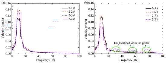 The peak frequency of workshop vibrations in the vertical direction caused by the road traffic was concentrated around 10 Hz. The vibration in this frequency range was attenuated with the vibration propagation from the first floor to the second floor in the workshop. The vibration of the second floor slab was affected by the excitation induced by the production equipment, which resulted in localized peaks in the frequency band above 20 Hz. FFT spectra of vibration velocity in the vertical direction at all locations of test section 2 # are shown in Figure 11.