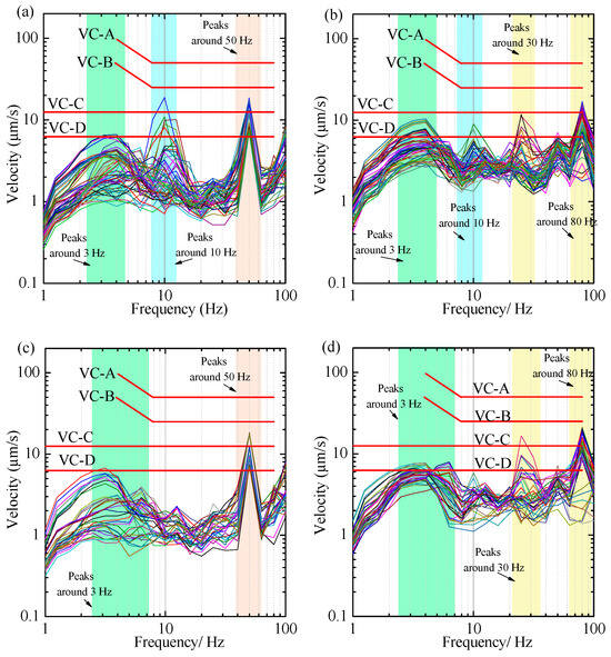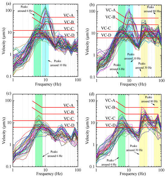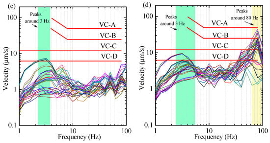 Figure 12a,b show the 1/3 octave spectra of vertical vibration at the measuring points on the first and second floors in the daytime (6:00 a.m. to 10:00 p.m), and the nighttime spectra (10:00 p.m. to 6:00 a.m. on the next day) are presented in Figure 12c,d. In the daytime, the vertical vibration response of the measuring points on the first and second floors far exceeded the VC-C limit in a wide frequency range. At night, some test conditions of the vertical vibration response on the first floor exceeded the VC-C limit of around 6 Hz, while the vertical vibration response on the second floor in the peak frequency band of around 30 Hz and 80 Hz also exceeded the VC-C limit.