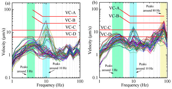 Spectra of vertical vibration at test section 2 # on the (a) first floor and (b) second floor.