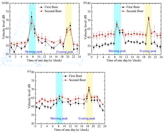As shown in Figure 15, the square and circular dots represent the means of the vibration responses, and the vertical short line represents the standard deviation of the vibration responses. It can be seen from Figure 15 that the mean value and standard deviation of the vibration levels in the workshop have obvious variations at different moments, mainly due to the random road traffic flow on the expressway. However, it can be observed that the mean values of the vibration level magnify with the increased traffic flow in the morning and evening peak periods. During the three days when the three test sections were measured, respectively, the morning peak periods were uniform, which appeared in the period of 8:00 a.m. to 9:00 a.m., while the evening peaks primarily appeared in the period of 7:00 p.m. to 9:00 p.m.