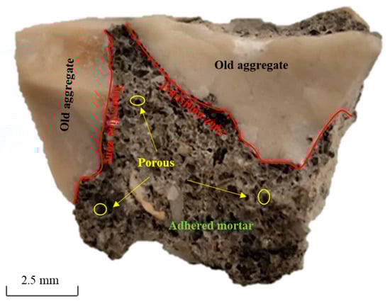 The CDW was collected from a demolished building comprised of a concrete structure that was more than 20 years old in Nanchang City, China. Then, the iron was separated, and the original CDW was cleaned. Furthermore, the CDW was crushed using a jaw crusher in the laboratory and screened to make the particle sizes of the recycled concrete aggregate the same as crushed stone (see Table 1). The density and water absorption of the CDW were determined to be 2386 kg/m3 and 5.71%, respectively. According to the classification of the density of recycled coarse aggregates in the GB/T 25177-2010 standard [], this type of recycled aggregate is at the class II level. Figure 1 shows one particle of CDW used. It is easily observed that the old mortar adhered to the old natural aggregates, and transition zones exist at their junction. There is also high porosity in the adhered mortar, which is responsible for the high water absorption of the recycled aggregates.