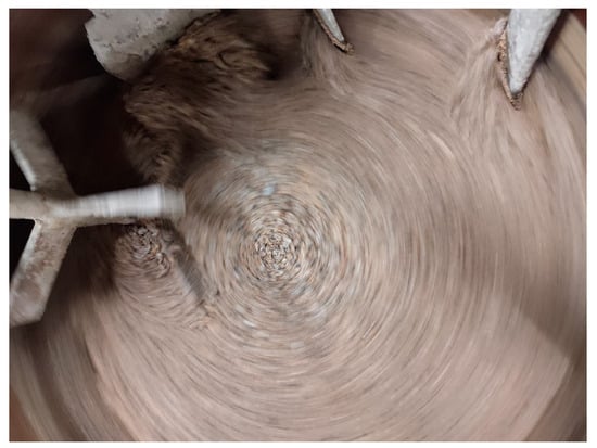 In this study, five concrete mixtures were prepared. Initially, a control concrete (C5) was designed with a compressive strength of 30 MPa, a cement content of 400 kg/m3, and a water/cement ratio of 0.5. All aggregates used were in a dry state, and the water for saturating the aggregate was considered in the mixing process. Specifically, a vertical shaft mixer with a volume of 20 L was utilized for the mixing process, as depicted in Figure 2. The aggregates were added sequentially, starting from those with larger particle sizes and progressing to the smaller ones. Following a mixing period of one minute, “aggregate saturation water” was poured in and mixed for an additional 3 min. Subsequently, the mixture was allowed to stand for 10 min to ensure the thorough absorption and saturation of the aggregates. Next, cement was added, followed by stirring for 1 min, after which water (mixing water) was gradually introduced. Following the addition of water, stirring continued for 3 min to complete the production of fresh concrete. Then, the slump of the fresh control concrete was determined to be 10 cm.