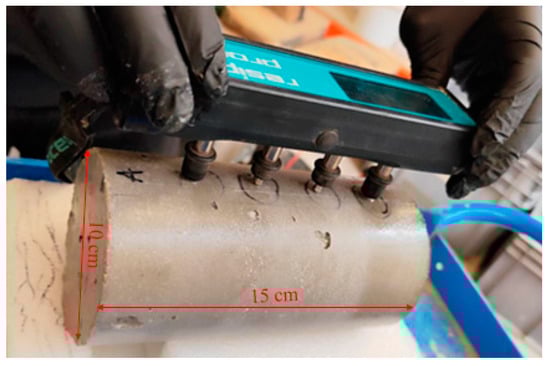 The electrical resistivity of the concrete was measured using the Wenner four-electrode method using specimens with a diameter of 10 cm and height of 20 cm, cured for 7 days, 14 days, and 28 days prior to testing (see Figure 3).