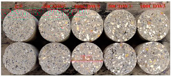 Figure 5 shows the variation of the slump of concrete with the incorporation of CDW. It is easily seen that the slump values of the concrete with the incorporation of 0%, 50%, and 100% CDW water/cement ratios were 0.5 and 0.3, respectively. When the concrete mixture had a water/cement ratio of 0.5, the slump values of the concrete increased with an increased CDW content. The slump value of fresh concrete increased by 33% and 23% as the CDW content increased from 0 to 50% and 50% to 100%. According to the ASTM C 192 standard [], all aggregates with the surface saturated dry condition were used. So, the water for saturating the dry aggregates (aggregate saturation water) was calculated, considering the water absorption capacity and free surface moisture (see Table 2). However, the initial free water of fresh concrete increased when the aggregate saturation water was added. Furthermore, the higher initial free water was mainly responsible for the increase in the slump value of the concrete with CDW. Kou et al. [] and Behera et al. [] also observed the same phenomenon of workability in their works and noted that the dry aggregates absorbed the saturation water. Therefore, water was not available for the further reaction of cement hydration.