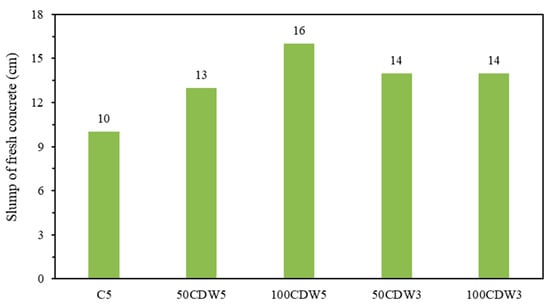When the water/cement ratio decreased to 0.3, the superplasticizer was used to justify the slump in the concrete. The 1% superplasticizer achieved a slump of concrete between 13 and 16 cm. At this time, comparing the concrete with a water/cement of 0.5, the slump of concrete with 50% and 100% CDW increased by 7.7% and decreased by 12.5%, respectively.
