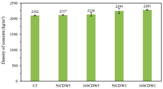 Figure 6 presents the density of all the concrete. The density of the concrete had no significant difference since the density of the CDW and natural coarse aggregates used were similar. Based on Table 1, it can be seen that the density of CDW was 7.9% higher than that of the natural coarse aggregate. Therefore, the density of concrete with a water/cement ratio of 0.5 increased by 0.7% and 1.7% as the CDW content increased from 0 to 50% and 50% to 100%, respectively. When the water/cement ratio changed to 0.3, the density further increased since the coarse aggregate content increased (see Table 2). That is, the density of the concrete with 50% and 100% CDW increased by 6.0% and 6.7%, respectively. Additionally, it can be noted that the possibility of errors was greater when the CDW was incorporated into the concrete compared to the control concrete. This is due to the fact that the CDW still had insufficient homogeneity during the actual operation. Therefore, in future work, the mixing procedure of coarse aggregates such as CDW needs to be optimized.