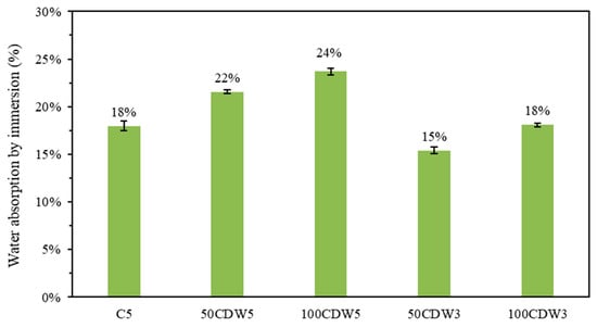 Figure 7 illustrates the water absorption by immersing the concretes. Consistently across varying water/cement ratios, the water absorption of the concrete increased with the incorporation of CDW. Specifically, when employing a water/cement ratio of 0.5, the water absorption by immersion increased by 33% with the introduction of 100% CDW into the concrete. Similarly, a 20% increase in water absorption by immersion was observed as the CDW content transitioned from 50% to 100% with a water/cement ratio of 0.3. This trend could be attributed to the inherently higher water absorption capacity of CDW aggregates.