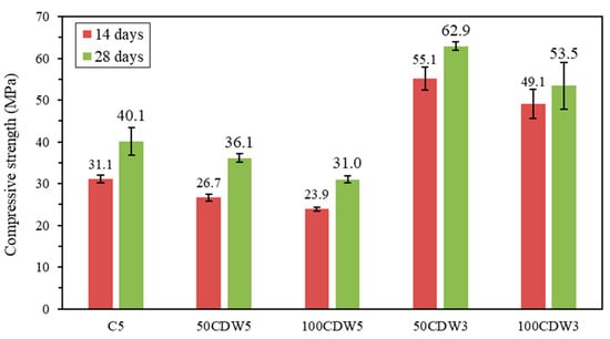 Compressive strength is an important mechanical property of concrete. There are numerous studies that have presented that with an increasing CDW content, the compressive strength of concrete decreases [,,,,,]. Figure 8 shows the compressive strength of concrete after curing periods of 14 and 28 days. It can be seen that the compressive strength of concrete decreased as the CDW content increased under the same water/cement ratio condition. This phenomenon finds justification in the presence of numerous transition zones and porosity within the CDW aggregates, which inherently compromise the mechanical integrity of the concrete matrix.