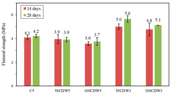 Figure 9 presents the results of the flexural strength of concrete after curing for 14 and 28 days. The results reflect the same trend as the results of compressive strength; the flexural strength of concrete with a water/cement ratio of 0.3 was larger than the mixture with a water/cement ratio of 0.5. After curing for 28 days, there was an increase of 43.6% and 37.8% for the mixtures of 50% and 100% CDW, respectively. It can be seen from Figure 7 that concrete with a water/cement ratio of 0.3 was denser, therefore the mechanical behavior improved. Similarly, Korouzhdeh et al. [] and Zivica [] observed that a reduction in the water/cement ratio of concrete led to a decrease in the pores within the cement slurry. This results in the enhanced compactness of the cement slurry, consequently bolstering the strength of the concrete transition zone and further enhancing the mechanical properties of the concrete.