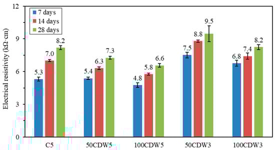 Moreover, the electrical resistivity value of the concrete prepared with a water/cement ratio of 0.3 surpassed that of mixtures with a ratio of 0.5. For instance, there was a notable increase of 30% and 24% in the electrical resistivity value for concrete containing 50% and 100% CDW, respectively, after curing for 28 days. This observation is corroborated by Figure 7, which illustrates that concrete with a water/cement ratio of 0.5 tends to exhibit higher porosity.