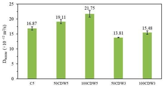 The results of the non-steady-state migration coefficient (DNSSM) of concrete are shown in Figure 11. A increase in the DNSSM means that the resistance to chloride ion penetration by the concrete is reduced. When the water/cement ratio of concrete was 0.5, the DNSSM increased by 13.3% and 29% as the CDW content increased from 0 to 50% and to 100%, respectively. The DNSSM of the 100CDW3 mixture was 12.1% higher than 50CDW3. It can be explained by the significant amount of porosity in the CDW, causing the high porosity of concrete. That can be proven by the results in Figure 7.