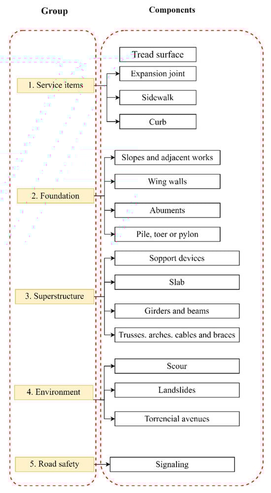 Five (5) groups have been defined for the bridges, each containing a set of components according to their typology. Figure 1 shows their standard confirmation. These groups represent the parts that make up bridges, where the components of groups 2, 3, and 4 are related to structural stability. The components of groups 1 and 5 are related to functionality and road safety, respectively.