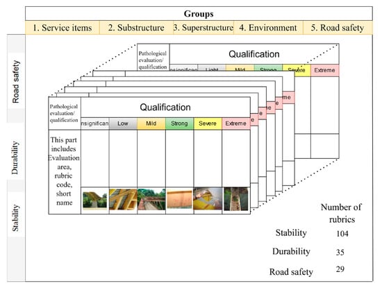 Figure 3 shows the structure of this damage catalog, which includes the number of headings of the three (3) assessment components stored in the inspection application used for field inspection work, as shown in Figure 4. It serves as a dynamic damage catalog that can be expanded or refined as the system is implemented, allowing for the inclusion or adaptation of additional damage types. This ensures a comprehensive examination of the primary pathologies affecting bridge components during visual inspections in the field. Figure 3 shows the number of rubrics for each evaluation area that are part of the damage catalog. This was determined based on the number of identified damages in each area for each component, with a higher number related to stability compared to durability or road safety.
