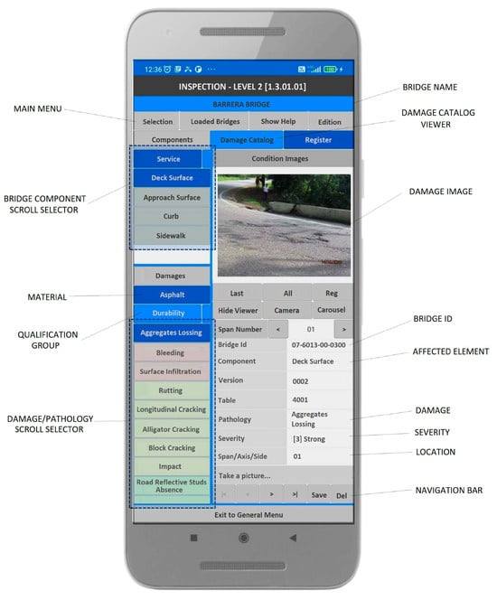 A mobile application (shown in Figure 4) has been implemented to digitally capture data associated with visual inspection tasks. This increases the data acquisition on field. It is important to document any damage and record its extent and severity using built-in rubrics. Relevant inspection information should be imported to identify components associated with the inventory. The status of routine and preventive maintenance should also be recorded. Finally, the collected data should be exported to a central geodatabase in the cloud. This development is part of a line of research around the world where technological applications are being implemented to support visual inspection and damage detection on bridges [,,,,,,]. The time during which this application should be used in the field depends on the index of each bridge, as explained in Table 3. This time varies from an immediate visit to the bridge if it has an index of “Susceptible to partial or total failure” to 5 years for an index of “Satisfactory”.