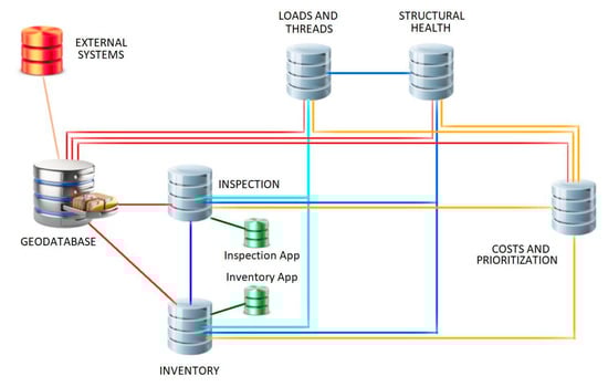 The application was developed on Microsoft’s Xamarin platform and uses an internal Sqlite 3 database. The REST services used to send and load data were implemented using Net Core 6.0 and are hosted in a SqlServer spatial database compatible with ESRI’s ArcGis, in an SAAS cloud service provided by Azure. The images are sent to the server through an SFTP service that uses a fragmentation technology to send data from areas with very low Internet coverage since, in Colombia, there are many bridges in sparsely populated areas with no or very low cellular coverage due to its topography and extension. This application is part of Inspection Module 2, as shown in Figure 5, which shows the system architecture. The system includes several important modules such as inventory, loads and hazards, structural health, and prioritization.