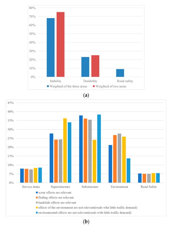 Based on the above, a survey was developed and completed by nineteen (19) experts in the field of bridges at the national level. Some of the results of the determined weights are shown in Figure 6 by evaluation areas and groups of bridges. As can be seen in Figure 6a, the order of importance at the level of the evaluation areas is as follows: stability, durability, and traffic safety. Durability and road safety have one-third of the importance, and the rest corresponds to stability, which is mainly related to relevant structural damage, as well as to the problems of scour and torrential flooding on bridges. Figure 6b shows the importance levels of the bridge groups for different conditions related to their environment, such as scours, torrential flows, and landslides.