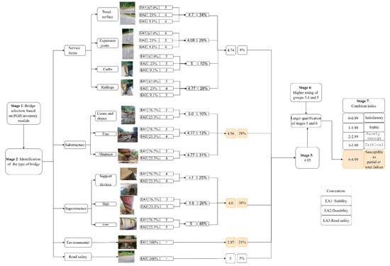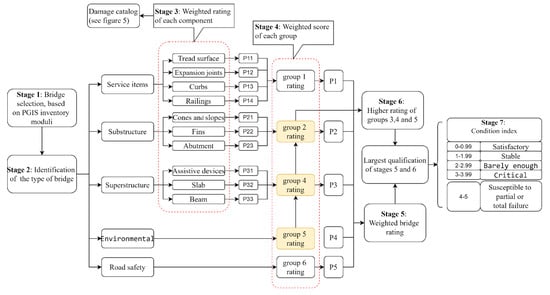 The inspection is a detailed visual evaluation that aims to provide an objective assessment of the condition of the bridge by adequately recording and qualifying the type, location and intensity of damage or deterioration present in various elements of the structure. Two levels were used to determine the condition of the structure. The first one is the deterioration index, which concerns the evaluation of the condition of each component of the bridge. The second one is the bridge condition index, which considers the evaluation of the groups and their weighting with hierarchies [].