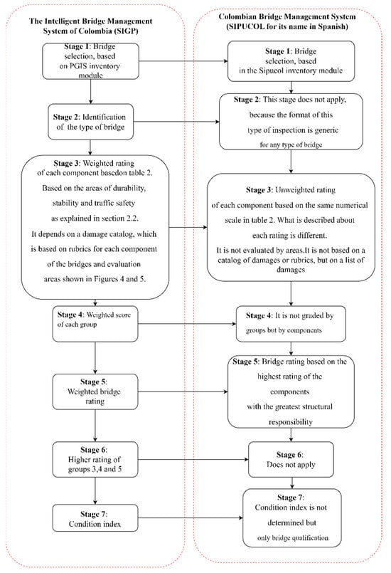 The management systems shown in Table 1 have been developed to maintain existing structures where variables intervene such as design errors, deficiencies in construction processes and quality control, inappropriate selection of technical specifications, incomplete plans for maintenance, rehabilitation, or replacement work, the experience of inspecting engineers, typical recurrent and relevant damage, partial or total collapse, structural health campaigns, traffic accidents, overloaded trucks, bridge designs with hydraulic and hydrological deficiencies (scour and torrential flooding), steel bridges without the design of their elements, and fatigue connections, among others, intervene [].