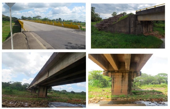 The third component is road safety, which is related to the functionality and safe operation for bridge users (drivers, passengers, cyclists, motorcyclists, and pedestrians); on the other hand, it is one of the most innovative aspects in bridge design regulations [], as well as in road safety regulations [], especially in the specifications for guardrails or traffic barriers (vehicular and pedestrian). This situation is worrying due to the increasing number of high-performance vehicles on Colombian roads, especially trucks. The excessive rigidity of the containment elements and the lack of transition elements between them and the flexible barriers at the bridge entrances have led to serious accidents with light vehicles. The presence of sidewalks along bridges with heavy traffic and high operating speeds and in urban areas is a dangerous aspect that should also be evaluated during bridge inspections.