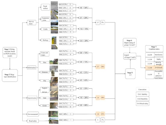 The evaluation criteria for the bridge groups (superstructure, substructure, environment, service elements, and traffic signs) were defined as the weighted average of the worst evaluation using the criteria shown in Table 2 for the condition of the components. The hierarchical analysis decision method was used to define the weighted average [].