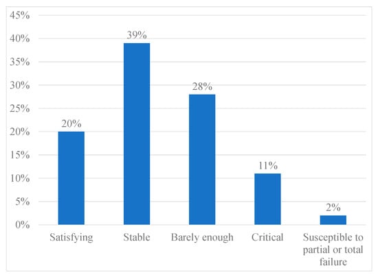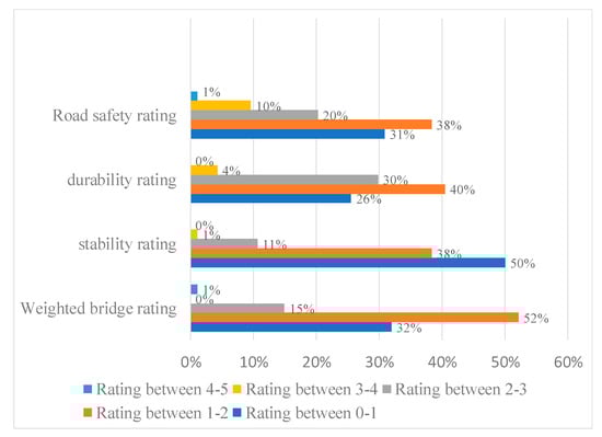 Figure 13 shows the results of the condition indexes of the 94 bridges that were part of the pilot selection, showing that only 2% are susceptible to partial or total failure and 11% are in critical condition. Figure 14 also shows the overall weighted rating of these bridges for stability, durability, and road safety. According to these results, the ratings and, therefore, the identified damages of the bridges are higher for traffic safety than for durability and stability. And there are more relevant damages for durability than for stability.
