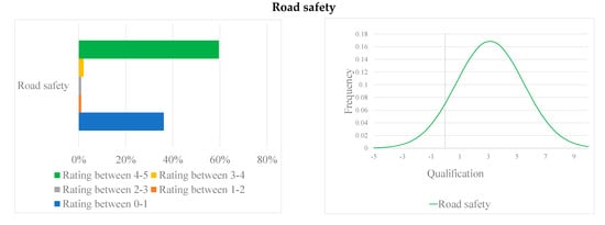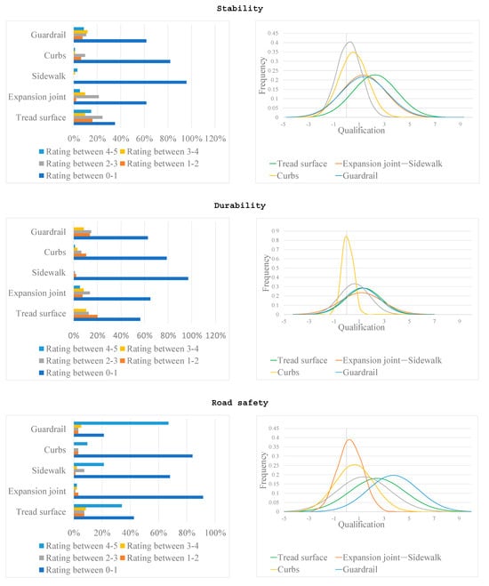 In the area of road safety, higher damage was detected in the guardrail, with a percentage of 67 percent at the “extreme” severity level, which represents a warning to make the appropriate corrections in the intervention tasks. From a probabilistic point of view, the average rating had the following order from highest to lowest in the area of road safety: guardrails, expansion joints, sidewalks, curbs, and expansion joints. A similar standard deviation was found for all components in this group.
