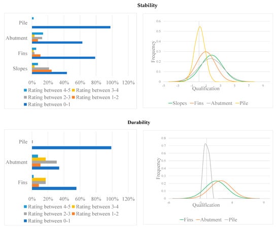 Figure 17 shows the results of the evaluation of the severity levels in each evaluation area of the components that are part of the substructure group. In the stability area, higher damage was observed in the abutments and slopes, with a percentage of 14 and 7 percent, respectively, at the “extreme” severity level. In addition, 3 percent damage was observed in these same components at the “severe” severity level. From a probabilistic perspective, the average rating had the following order from highest to lowest: slopes, abutments, fins, and piles. A higher standard deviation was found for abutments and a lower one for piles.