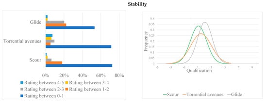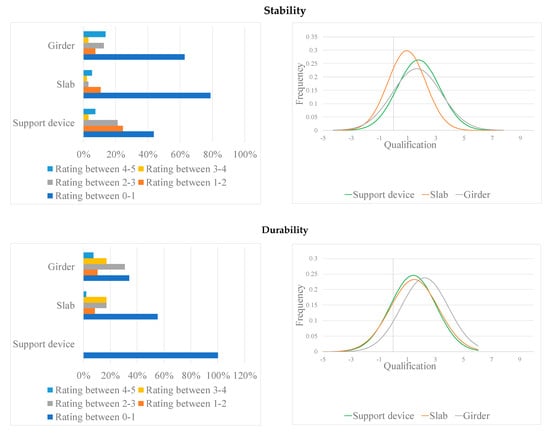 Figure 18 shows the severity evaluation results for each evaluation area of the components that are part of the superstructure group. In the stability area, higher damage was observed in the beam and support components, with a percentage of 15 and 7 percent, respectively, at the “extreme” severity level. In addition, 3 percent damage was observed in these same components at the “severe” severity level. From a probabilistic perspective, the average rating had the following order from highest to lowest carrier, beam, and plate. A higher standard deviation was found for the beams and a lower one for the slab.