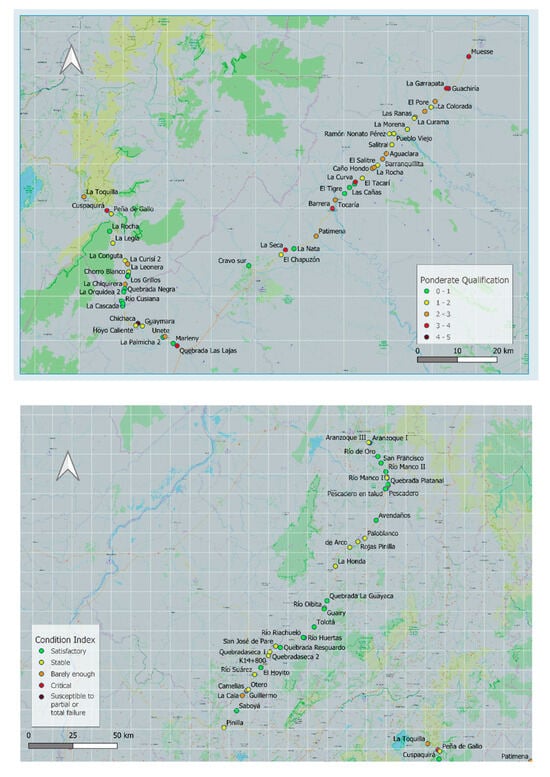 In the two application examples, it was found that the first bridge has a “critical” condition index and that its problem is mainly related to the non-compliance with the seismic vulnerability issue by not having seismic buffers and that this structure is located in a high seismic hazard zone. It has problems mainly in the areas of stability and road safety. The second bridge has a condition index of “susceptible to partial or total failure” related to the service life (more than 50 years) because it has problems in the three (3) evaluation areas, mainly in the area of scour and torrential flooding. In addition, there are problems with fatigue, corrosion, and lack of load capacity.