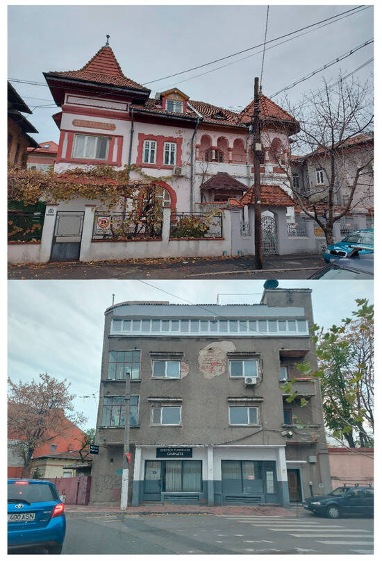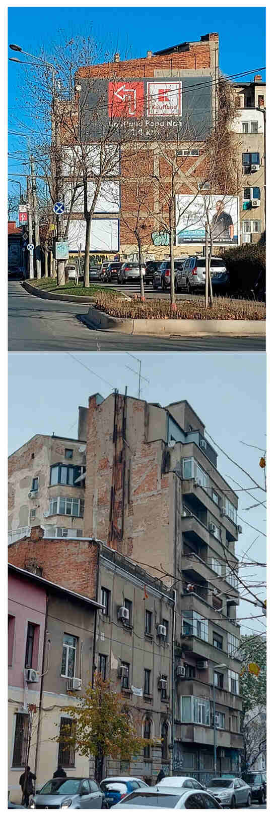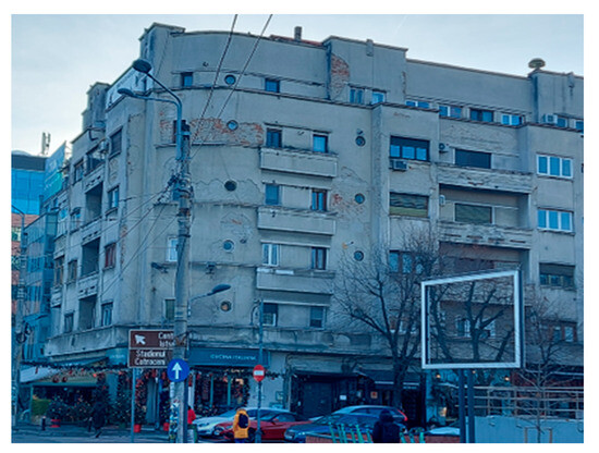 Examples of the above-mentioned typical structural typologies located in Bucharest are given in Figure 1. It can be observed that their current states from the point of view of maintenance and current repair works are not adequate at all. Figure 2 shows the typical structural layout of a high-rise reinforced concrete building that was constructed before 1940 in Bucharest [28]. Other examples of typical low-rise structures located in Bucharest are shown in Figure 3.