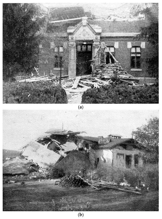 Some photos showing the damage in various publications from the time of the event highlight both the effects and the common structural typologies described previously. Figure 4 shows the damage sustained by unreinforced masonry buildings located in Panciu (near the earthquake epicentre), where 338 buildings sustained heavy damage or collapsed [29].
