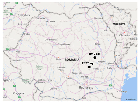 In this section, a comparison of the effects of the two largest Vrancea intermediate-depth earthquakes which occurred in the XXth century is shown. The comparison of the effects of the two events, which had different magnitudes and focal depths, might help in understanding the effects of future Vrancea large-magnitude earthquakes. The effects of the 1940 earthquake are assessed based on various sources in the literature, while in the case of the 1977 event, the effects are summarized in [31,32] as well as in other studies (e.g., [12,13]). The seismological characteristics of the 1977 Vrancea earthquake are discussed in a significant number of studies in the literature. According to the ROMPLUS earthquake catalogue (https://infp.ro/data/romplus.txt, accessed on 1 February 2024), the moment magnitude of the 1977 earthquake (MW = 7.4) was smaller than that of the previous event in 1940, but the focal depth was significantly smaller (94 km vs. and estimated 150 km). Figure 6 shows the epicentre locations of the two events. It can be easily observed that the 1977 event was located much closer to Bucharest compared to the 1940 earthquake.