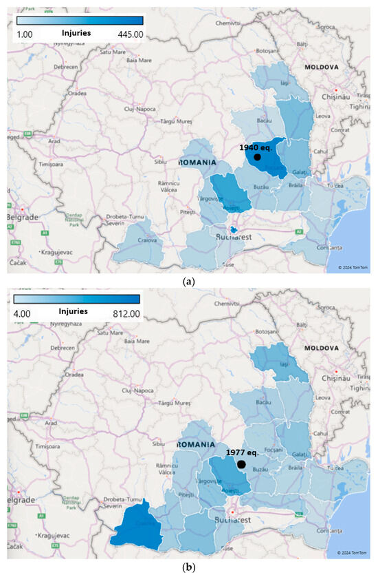 Injuries evaluated for the (a) Vrancea 1940 earthquake and (b)Vrancea 1977 earthquake.
