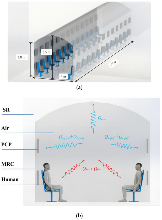 This improved integrated model fully considers the detailed heat and mass transfer process between the PCP and indoor air (including evaporation, condensation, and sliding movement of the liquid film). Additionally, the dynamic variations in the heat and moisture sources of the human body changing with environmental temperature and humidity are also considered. Additionally, the model incorporates the impact of the temperature of the surrounding rock on indoor air temperature and humidity. Therefore, a comprehensive mathematical model is established for large-scale application by using PCPs for indoor air temperature and humidity control, as shown in Figure 2.