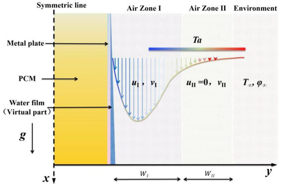 To calculate the complex heat and moisture exchange processes described above, reasonable simplifications must be made. This paper adopts a simplified two-zone model, as illustrated in Figure 3, which improves calculation speed, and the results are reliable [29]. According to the temperature and velocity distribution characteristics of the wall natural convection, the near-wall flow is divided into two regions. Zone I represents the primary area including the main natural convection flow. Zone II is the secondary natural convection area, where the natural convection is weak and the vertical flow velocity u is almost zero, which can be disregarded.