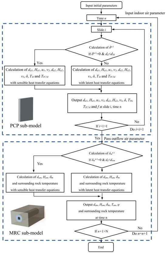 After discretization, the equations are programmed with C language and solved by using MATLAB R2016a software. The numerical calculation flow chart for the integrated MRC and PCP cooling and dehumidifying system is illustrated in Figure 6. Implicit discrete equations are solved through a joint-iteration method. The computational process starts at time n = 1 and layer I = 1 in the PCP sub-model. Once the calculation for one layer is completed, it stops and proceeds to the next layer. After all layers are computed at this time step, the results of natural convection air are transferred to the MRC sub-model as boundary conditions. Upon completing the computations for the indoor air and surrounding rock in the MRC sub-model, the indoor air parameters are read by the PCP sub-model, and the calculation progresses to the next time step.