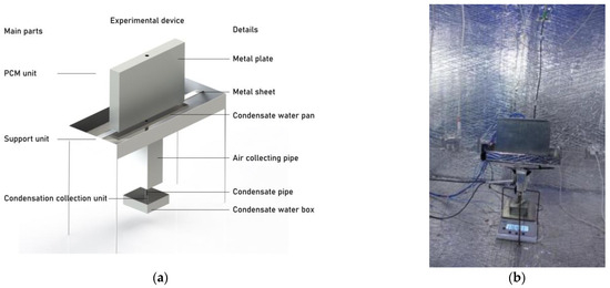 In summary, current research on building temperature control by using phase change thermal storage technology is a hot topic. However, high-humidity environments are prevalent in practical applications, and the influence of high humidity on the phase change thermal storage process is still in the early stages of investigation. In previous studies, the authors [28,29] experimentally explored the impact of high-humidity conditions on the melting process of PCP under natural convection and developed a corresponding mathematical model to describe the process. The results demonstrated that the melting rate of PCPs could be increased by over 60%, with a latent heat transfer ratio exceeding 80%. It is evident that high-humidity conditions significantly affect the heat transfer of phase change units, but exploration in real-world application scenarios is lacking. Therefore, two pressing issues remain to be addressed: First, the issue regarding the extent to which the PCM unit is affected by time-varying high-humidity environments along with corresponding design and control methods, which is not yet clear in practical application scenarios. Second, the feasibility of utilizing the condensation characteristics of the PCM unit in high-humidity environments for simultaneous passive temperature and humidity regulation is also unknown and requires further exploration.