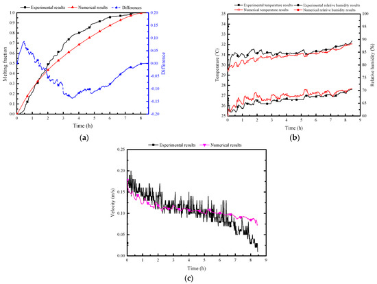 Validation of numerical results with experimental test data: (a) melting rate of PCP; (b) natural convection airflow temperature and humidity; (c) airflow velocity.