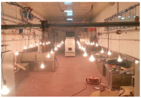 The MRC experiment was conducted in a 50-person MRC laboratory, also located in Chongqing, China, as shown in Figure 9 [36]. The laboratory walls are constructed in concrete with a thickness of 0.7 m. The MRC is equipped with 40 heat lamps, each rated at 150 W, to simulate the heat production of the human body. The initial air temperature in the MRC is set to 25 °C.