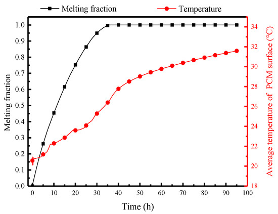 Figure 8 illustrates a comparison between numerical simulation results and experimental test data for the PCP’s melting rate, natural convection airflow temperature, humidity, and velocity. The overall agreement is deemed acceptable. The average error of melting rate is 6%, the average error of temperature is 0.4 °C, the max error of relative humidity is 5%.