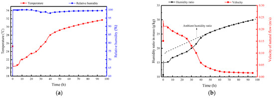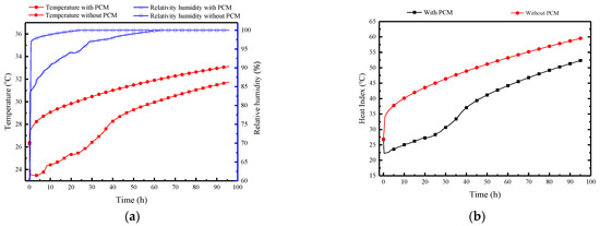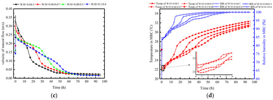 Therefore, as the W/H ratio of the PCP increases, both the indoor temperature and the relative humidity show a decreasing trend, as shown in Figure 24d. Overall, a larger W/H ratio results in better temperature and humidity control effects, but it is with limitations. Within the initial 5 h, the W/H ratio of 0.04:1 demonstrates the most effective temperature and humidity control effect. This is attributed to the smaller W/H ratio providing greater natural convection intensity in the initial period, enabling lower indoor temperature and humidity control, albeit with a significantly shorter duration.