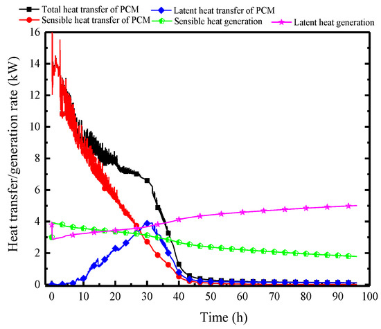 - Influenced by the time-varying indoor air temperature and humidity, the cold storage PCP often shows asynchronous states in the sensible heat transfer rate and the latent heat transfer rate. Under typical conditions, the sensible heat transfer is 14 kW in the first 10 h, far exceeding the indoor heat dissipation, and gradually decreasing afterward. The latent heat transfer gradually reaches its peak of 3.5 kW after 30 h, consistent with the moisture dissipation, and then it gradually decreases.