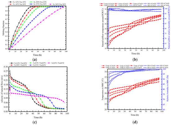 Variation in parameters of the PCP and MRC at different quantities: (a) melting rate of PCP; (b) natural airflow temperature and humidity around PCP; (c) natural flow velocity around PCP; (d) temperature and humidity in MRC.