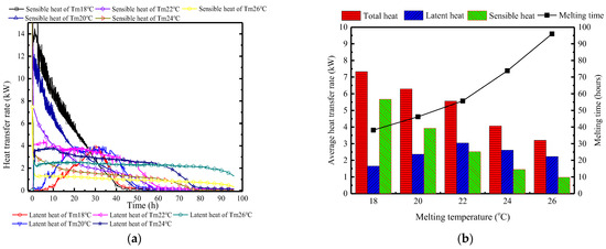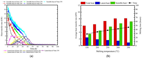 As shown in Figure 21a, an increase in the number of PCPs extends the melting time. However, the number of boards increases from 150 to 350, only extending the melting time from 30 h to 42.5 h; thus, the impact is significantly less than that of the Tc/Tm. The main reason lies in the indirect effect of the variation in the number of PCPs on the heat transfer process. Initially, the increase in the number reduces the indoor temperature and humidity, indirectly affecting the heat and moisture transfer process between the PCP and indoor air. Meanwhile, the surrounding rock, through its heat exchange with indoor air, indirectly absorbs the released cold from the PCP, weakening this process.