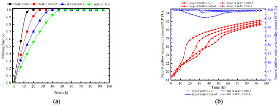 Figure 24a indicates that decreasing the width-to-height ratio significantly enhances the melting rate. Taking the melting time at a typical condition of W/H = 0.08/0.5 as a reference (38.1 h), the melting times change by 30%, −30%, and −60% when W/H is set to 0.1:0.4, 0.06:0.67, and 0.04:1, respectively. This pattern does not show a diminishing trend, suggesting that as long as the width-to-height ratio is small enough, instantaneous melting can be achieved. However, this may not be conducive to long-term thermal control. A preliminary inference can be drawn that the increase in PCP height can significantly strengthen the natural convection intensity, as confirmed by Figure 24c. When W/H is set to 0.04:1, it has the highest initial airflow velocity of 0.35 m/s, while W/H at 0.1:0.4 has an initial value of 0.23 m/s. Furthermore, Figure 24b observes that the near-wall natural convection outflow temperature and humidity are essentially consistent. This is due to the uniformity of the PCP’s cooling temperature, enabling the natural convection airflow to approximate the cooling temperature of the PCP. It can be further inferred that changes in the width-to-height ratio of the PCP have a different impact on the natural convection compared to the Tc/Tm. This impact is reflected by changes in the airflow velocity rather than the airflow temperature and humidity. The increase in the height of the PCP prolongs the natural convection path, allowing for more ambient air to be entrained into natural convection, thereby strengthening the intensity of natural convection.