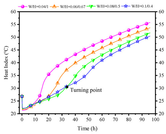 Figure 25 shows the influence of different W/H ratios of PCPs on indoor air HI. Apart from the case of W/H = 0.08:0.5, the enhancement of thermal control diminishes significantly, and the early-stage phenomena of higher temperature and humidity become apparent. Notably, for a W/H ratio of 0.1:0.4, the inflection point occurs at the 35th hour, and the subsequent reduction in thermal indicators reaches 4 °C. Crucially, these two sets of numbers show a trend of further change, namely a gradual postponement of the inflection point and a diminishing reduction in thermal indicators. This indicates that an increase in the W/H ratio of the PCP does not lead to an endless improvement in temperature and humidity control. Based on the current simulated conditions, a W/H ratio of 0.1:0.4 is approaching its critical point.