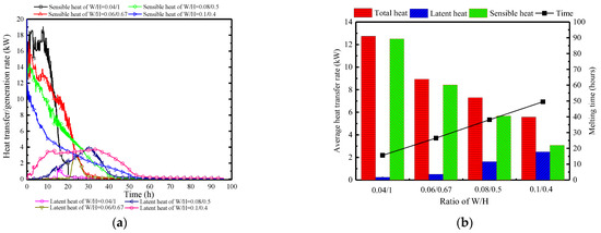 Figure 26 displays the variations in surface heat and moisture transfer rates of PCP under different W/H. Clearly, regardless of the PCP’s size, the surface heat and moisture transfer process are concentrated in the early stages. However, the larger the W/H ratio, the smaller the sensible heat peak, and the earlier and longer the latent heat occurrence. This is because the increase in the W/H ratio weakens the natural convection intensity, leading to higher initial indoor temperature and humidity, as seen in Figure 26a. Figure 26b provides a clearer reflection of the overall heat and moisture transfer. It can be observed that at a W/H ratio of 0.04:1, the proportion of the sensible heat transfer reaches 98%. As the W/H ratio increases to 0.1:0.4, there is a significant change in the proportion of latent heat transfer, with an increase to 45%. Additionally, compared to a W/H ratio of 0.04:1, the heat transfer rate decreases by 57%, indicating that an increase in the W/H ratio can extend the melting time, and strengthen the proportion of latent heat.